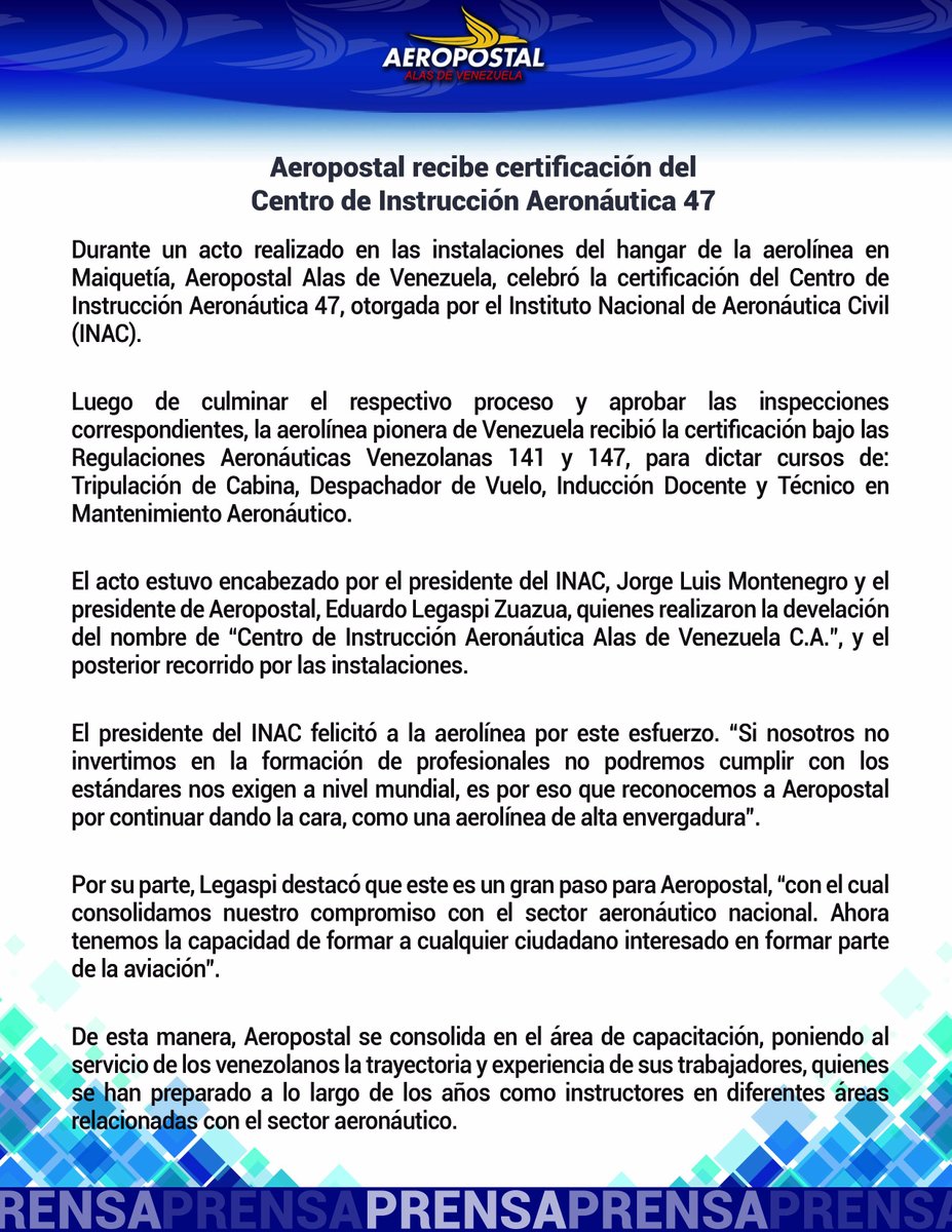 Aeropostal recibe certificación del Centro de instrucción Aeronáutica 47